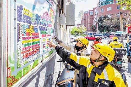 4月6日,邯郸市邯山区罗城头社区,外卖骑手对照道路通达指引图确认配送路线。 本报记者 田明摄