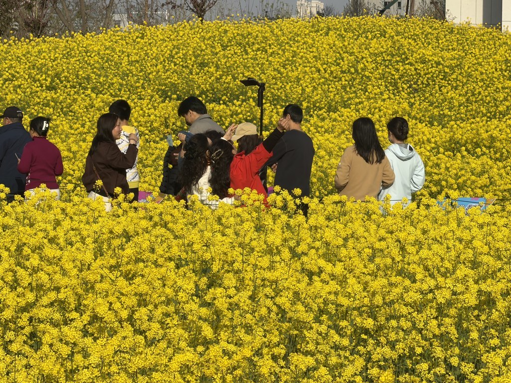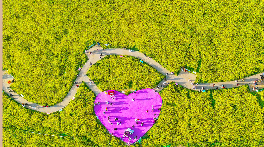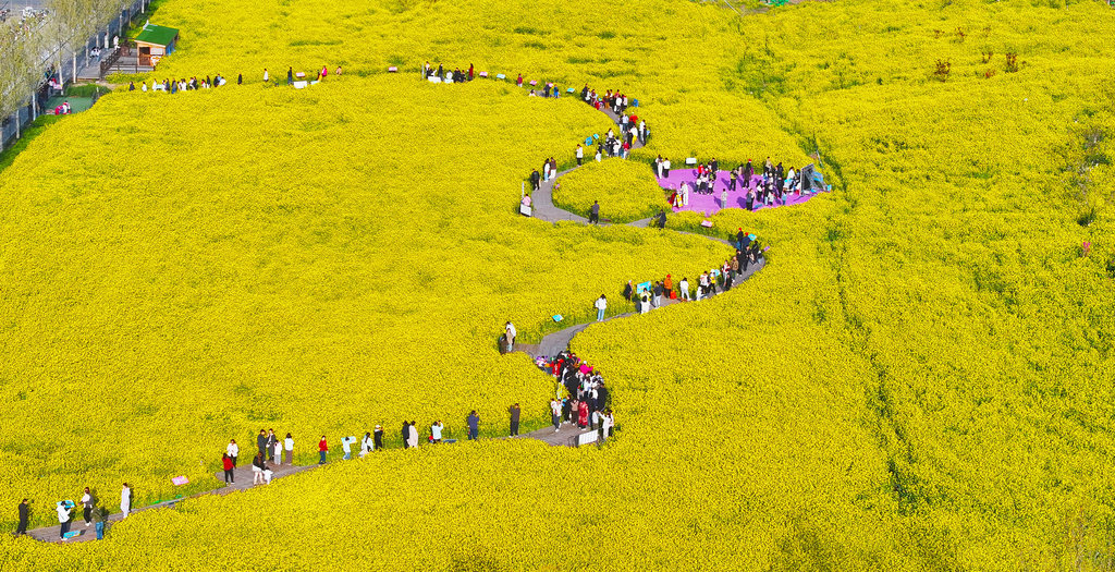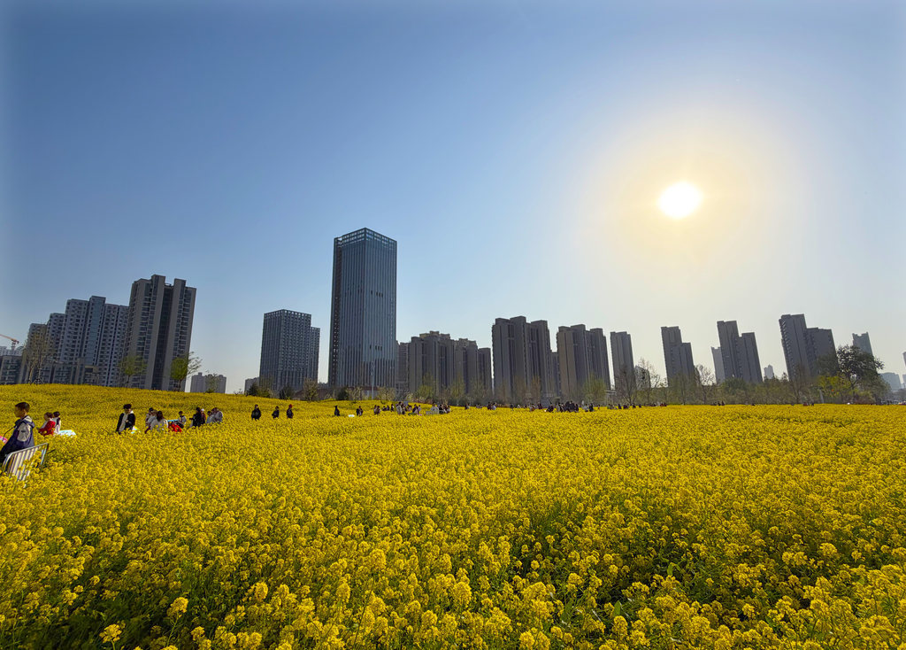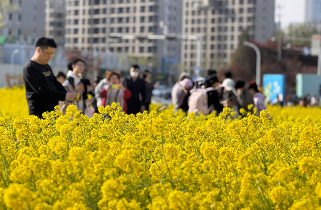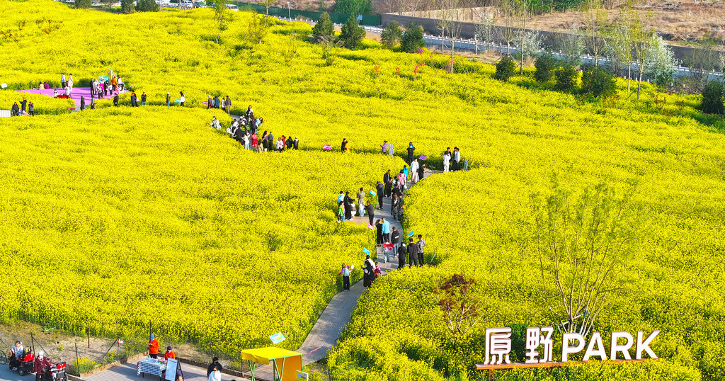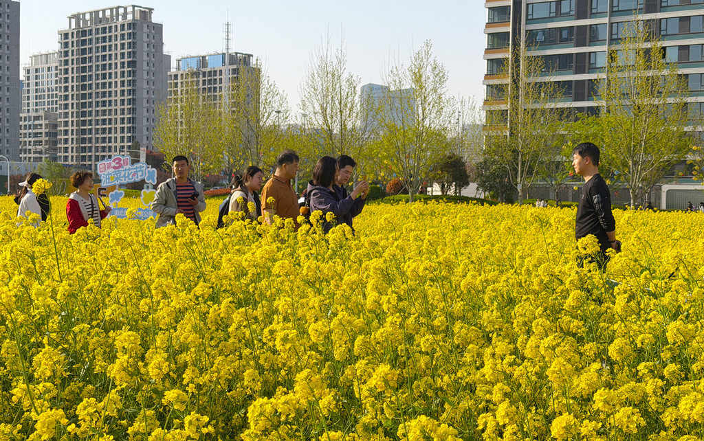 4月4日,市民在石家庄市高铁片区“原野PARK”城市口袋公园的油菜花海游玩。