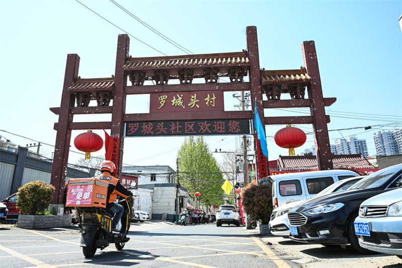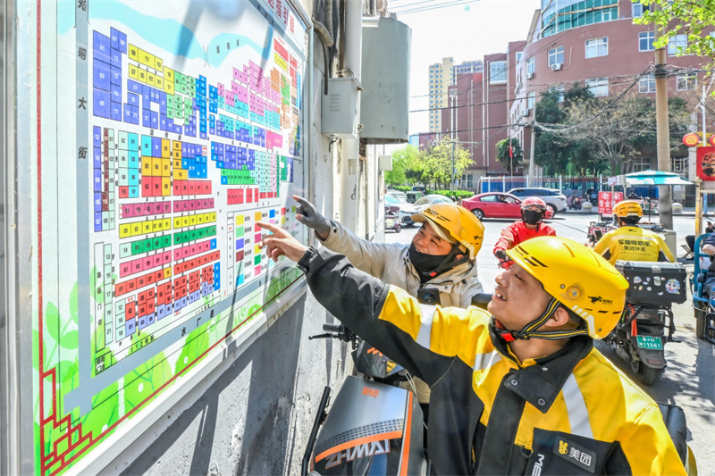 4月6日,邯郸市邯山区罗城头社区,外卖骑手对照道路通达指引图确认配送路线。