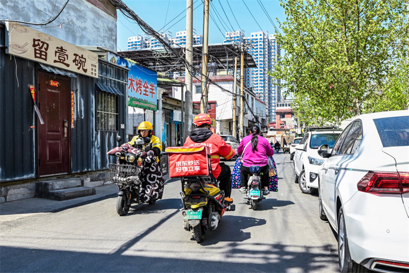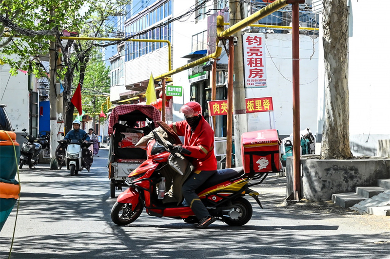 4月6日,邯郸市邯山区罗城头社区,外卖骑手在配送途中。