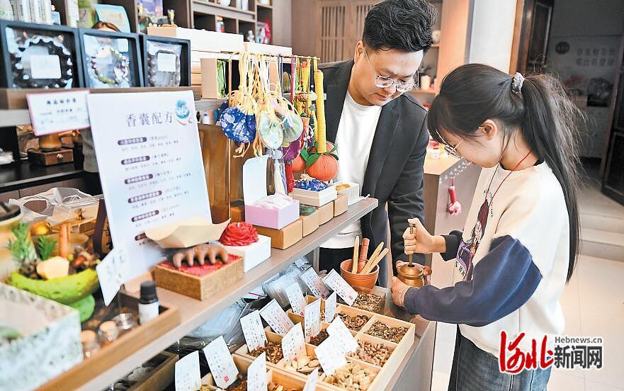 日前,游客在泉城扁鹊堂好南关旗舰店体验制作香囊。 河北日报记者 赵永辉摄