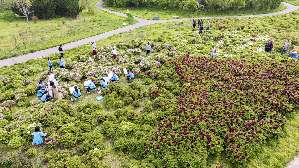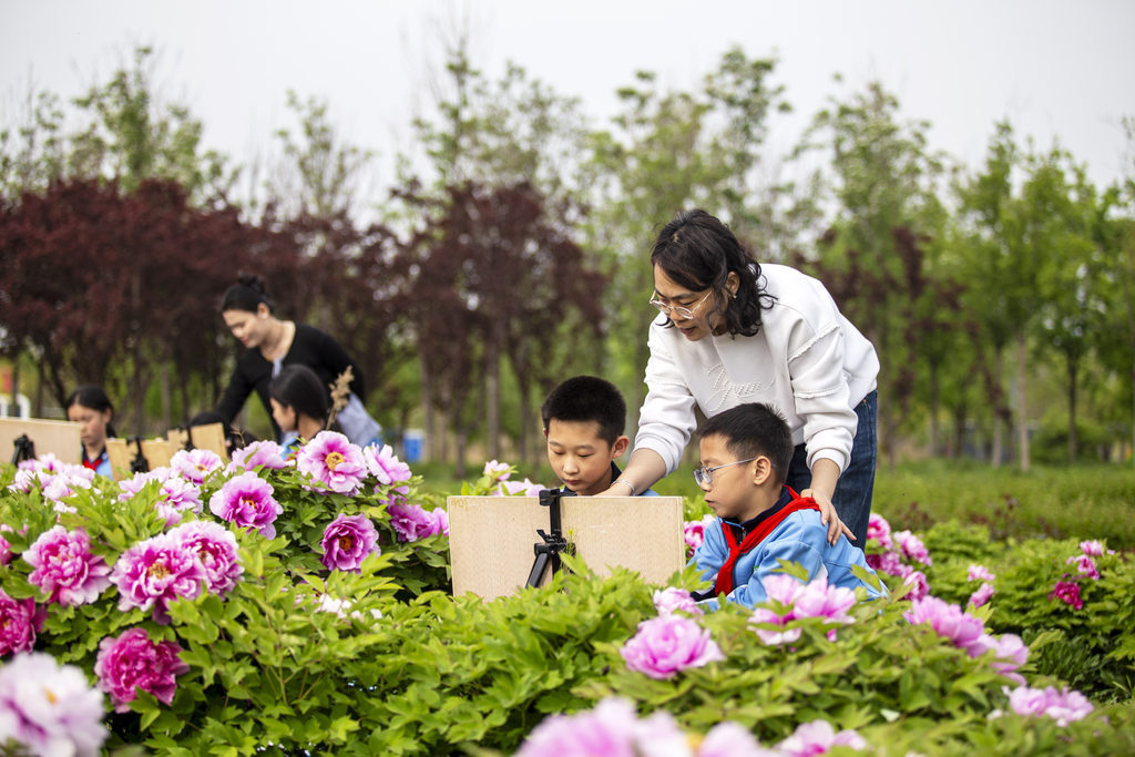 4月15日,孩子们在邯郸园博园写生。